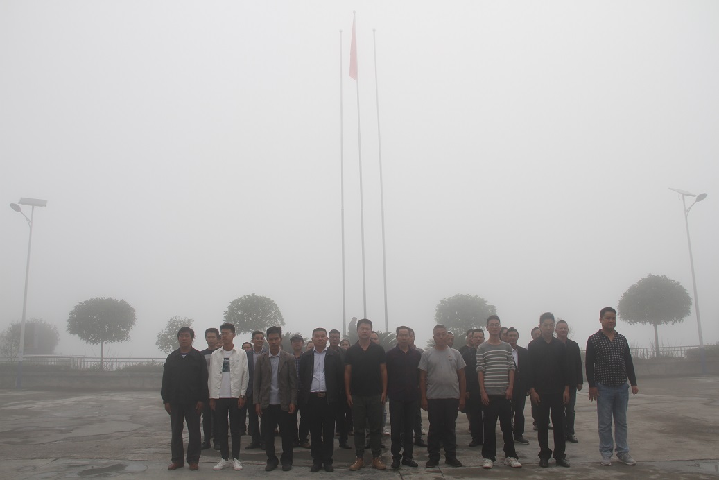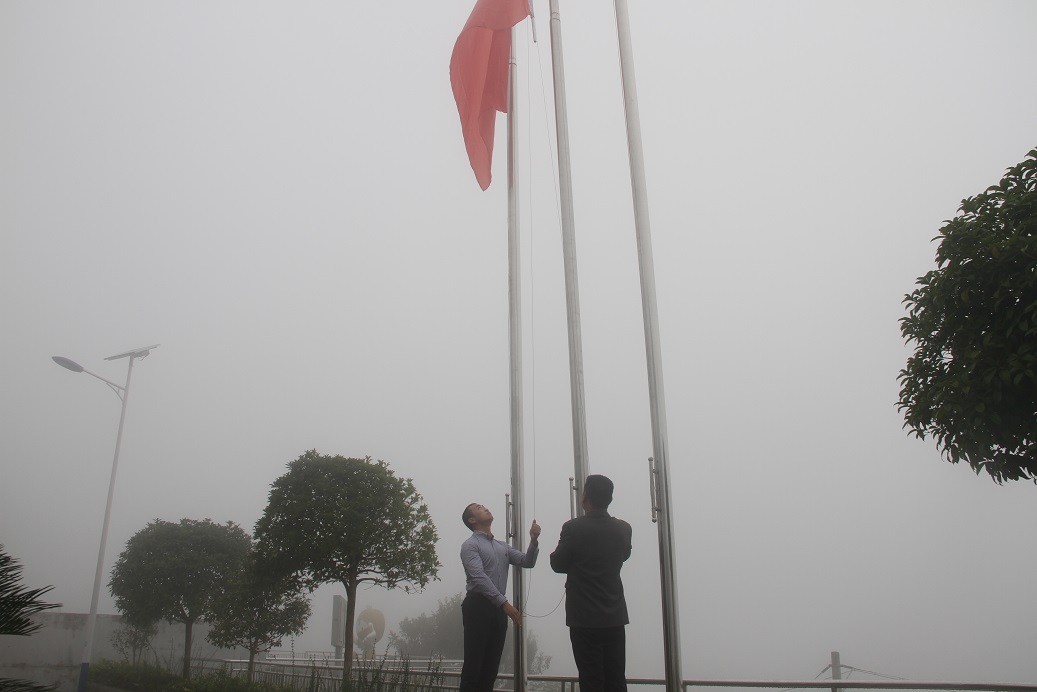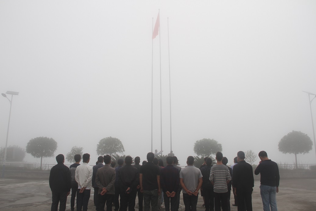 9時(shí)整,在晨霧中,雄壯的《義勇軍進(jìn)行曲》響起,鮮艷的五星紅旗徐徐升起,全體職工滿懷敬意行注目禮,共同高唱國歌,表達(dá)對(duì)新中國的崇敬和熱愛,祝福祖國70華誕。