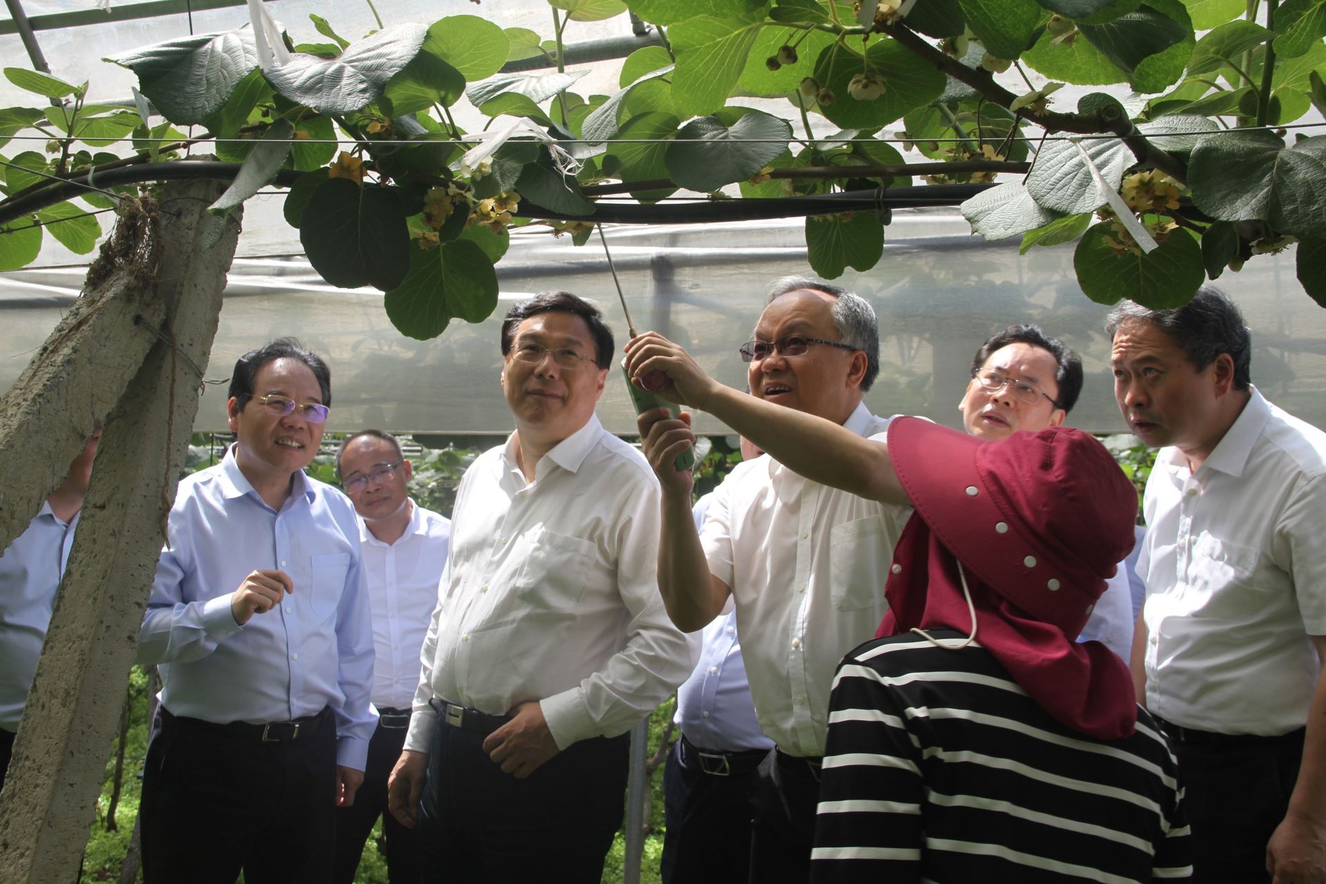 吳存榮一行來(lái)到獼猴桃基地,實(shí)地觀看了獼猴桃長(zhǎng)勢(shì)及授粉情況,洪忠進(jìn)董事長(zhǎng)向各位領(lǐng)導(dǎo)講解獼猴桃生產(chǎn)經(jīng)營(yíng)狀況并展示了水肥一體化智能操作系統(tǒng)。